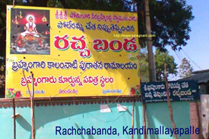 For festival (a Jatara) of the Poleramma (village deity) in Kandimallayapalle Village, people had approached Sri Madvirat Pothuluri Veerabrahmendra Swamiji for donation. The elders of the village summoned him to the Racchabanda, (a place like people’s court) and questioned him as to why he was not able to offer donation. Is it for the Swamiji, who re-incarnated as a human being to emancipate mis-beliefs and superstitions in the people to offer donation……? He uttered “Poleri! and orderd bring fire to lit up my cigar…” and instantly, the deity, with wide spread and long hair, instantly appeared in the shape of a woman with a fire stick in one hand and offered it to Swamiji. Thereupon seeing the miracle, realizing what had happened before their eyes, the elders of the village had fallen on his feet and requested him to pardon them. Now, this is the place is called the “Rachchabanda”. Which can be seennear the residence of Swamiji.