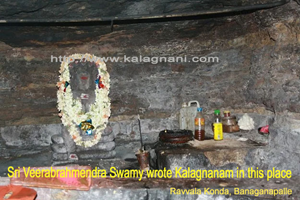 The small hilly area where Sri Veerabrahmendra Swamiji was looking after the cattle grazing daily, is called “Ravvala Konda”. This is located at a distance of 3 kilo metres from Banaganapalle. He used to draw a circle on the grazing area with his cane, allowing his cattle to graze within the circle and then enter into the cave and write Kalagnana there, while the cattle continue to graze. These hills the Ravvala Konda exist even now enthralling the tourists and devotees who visit the place on pilgrimage. To enter into the cave, we will have to go inside through the narrow steps provided. In the normal times, it is water logged upto knee deep level. We may find inside the cave indications of pathway, underground secret tunnels that lead to Kadapa Srisailam, Mahanandi etc. In the cave itself, there is an assembling place like a stage and it was widely believed that sitting on that Swamiji wrote his Kalagnana. There is a small pit in the cave itself, where, it is believed that Swamiji used to store drinking water. Even now, water flows through this pit, satisfying the thirsty tourists and devotees, with fresh and cool water. Considering the water of the pit as pure, sacred even the Nawab of Banaganapalle used to get it for his drinking purposes according to the beliefs of the people there.
